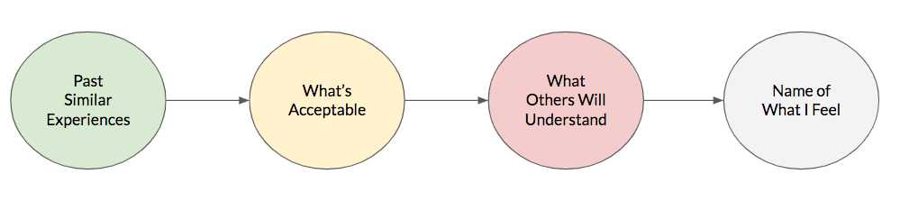 By comparison, we look for a previous experience that’s most like this current experience that we are having, which we’ve never had before. We pass that through a first filter of what others would find acceptable, because to communicate we can rarely separate ourselves from other’s perceptions of us. We then have to filter it again based on what others will understand, because to communicate it has to make sense to the listener. And out of this process comes The Name, or the description.
