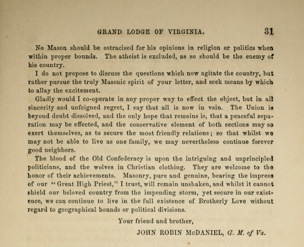 - The source of this information is the proceedings of the Grand Annual Communication, Grand Lodge of Virginia, 1861. The full proceedings can be found here, under the 1861 selection, page 31 of 74.