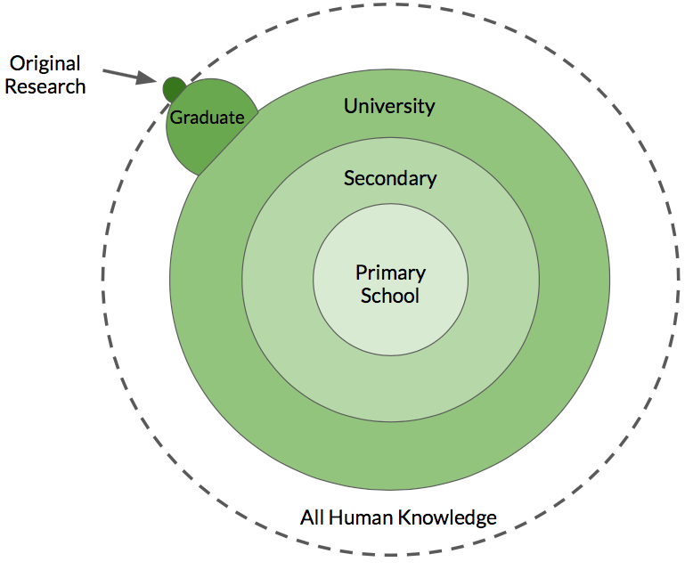 If we think of the dashed line as the boundary of all human knowledge, then original research (both applied and pure) is pushing past that boundary and discovering or inventing new knowledge that hasn’t existed before. But notice how each area gets smaller as you go. Pushing out the limits is hard and effortful. An entire career worth of research may amount to a small extra “bud” off of the main circle of your domain’s knowledge.