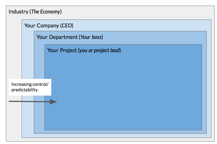 The more you go inside this nesting doll arrangement, the higher the level of control & predictability gets. In the outermost layer (“the economy”) no one really controls or can predict that, but in a hyper-local org like a project that you are working on at work, we have a great deal of control & predictability in comparison.