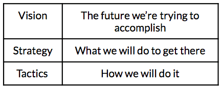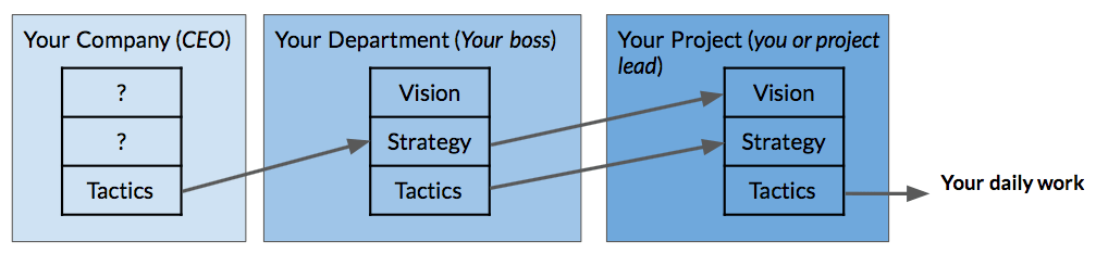 In a previous article, we covered the basics of vision, strategy, and tactics, and how they work in large orgs. In that article we dealt with the basic concept:
