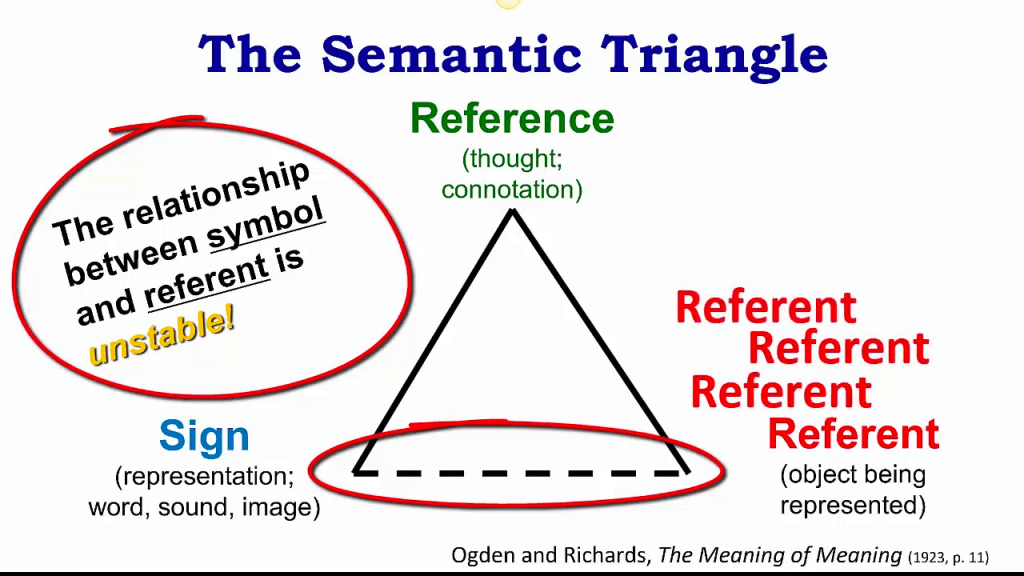 For this, we need the semantic triangle, consisting of sign, reference, and referent.